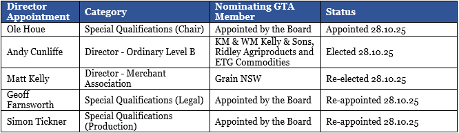 Following the 2025 Annual General Meeting (AGM) held on 28 October 2025, GTA members have elected the Board for the upcoming year. The 2024-2025 Annual Report, Chair’s address, and the 2025 AGM Meeting Papers can be found on the GTA website, graintrade.org.au/governance
